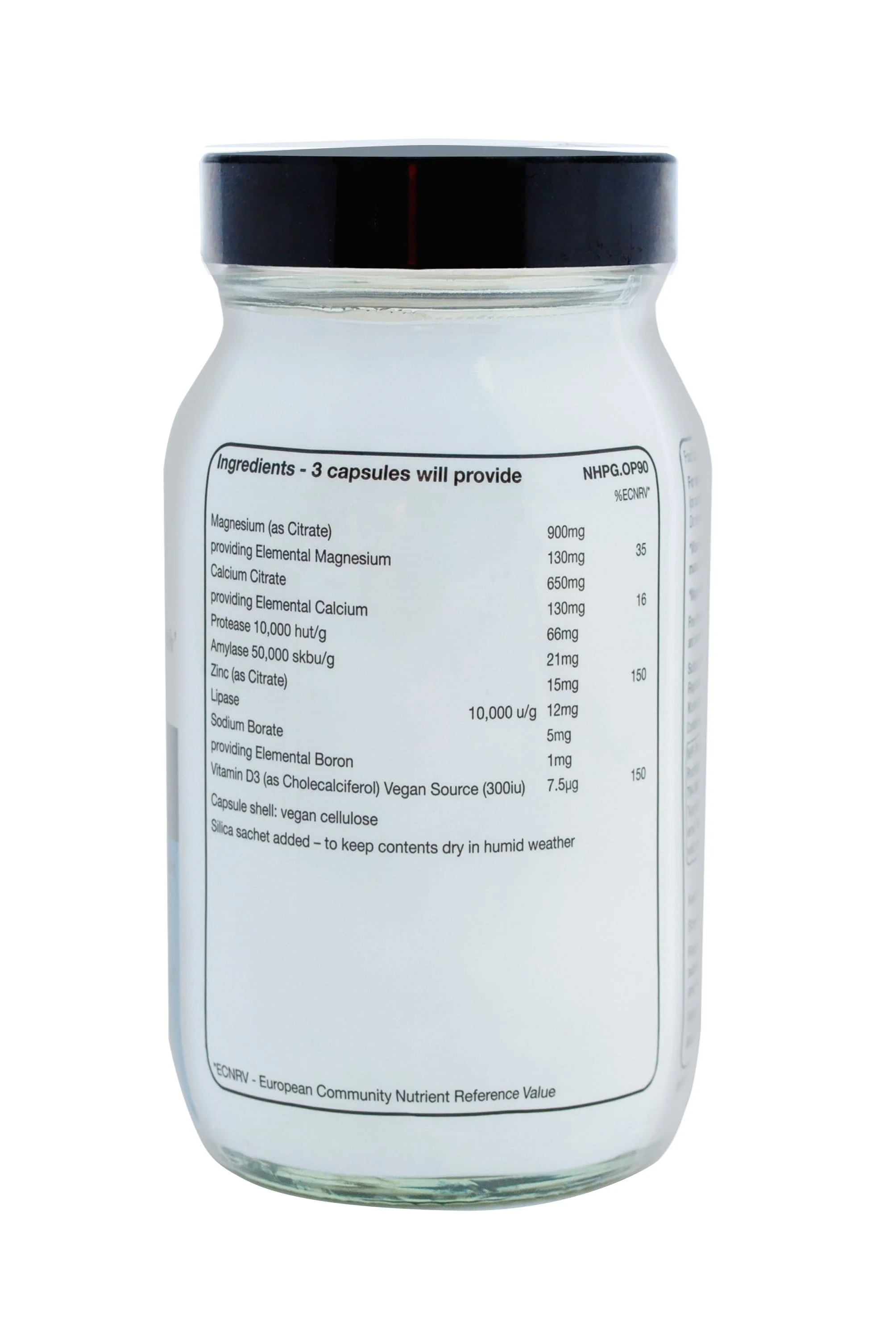 Magnesium Citrate, Calcium Citrate, Zinc citrate,Vitamin D, Sodium Borate, Protease, Amylase, Lipase, Anti-caking agent: Silica, Anti-caking agent: Magnesium Stearate